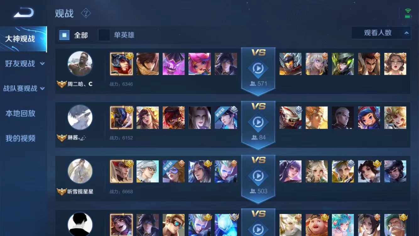 2、进入观战页面后,在页面左侧有个菜单栏,分别为大神观战、好友观战和本地回放等。可自行选择你要观战的类型。
